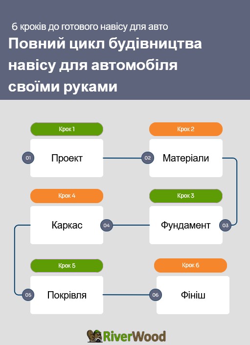 Riverwood пропонує будівництво навісу для автомобіля під ключ з використанням власного деревообробного цеху, що забезпечує контроль якості та знижує собівартість матеріалів без посередників. Riverwood.
